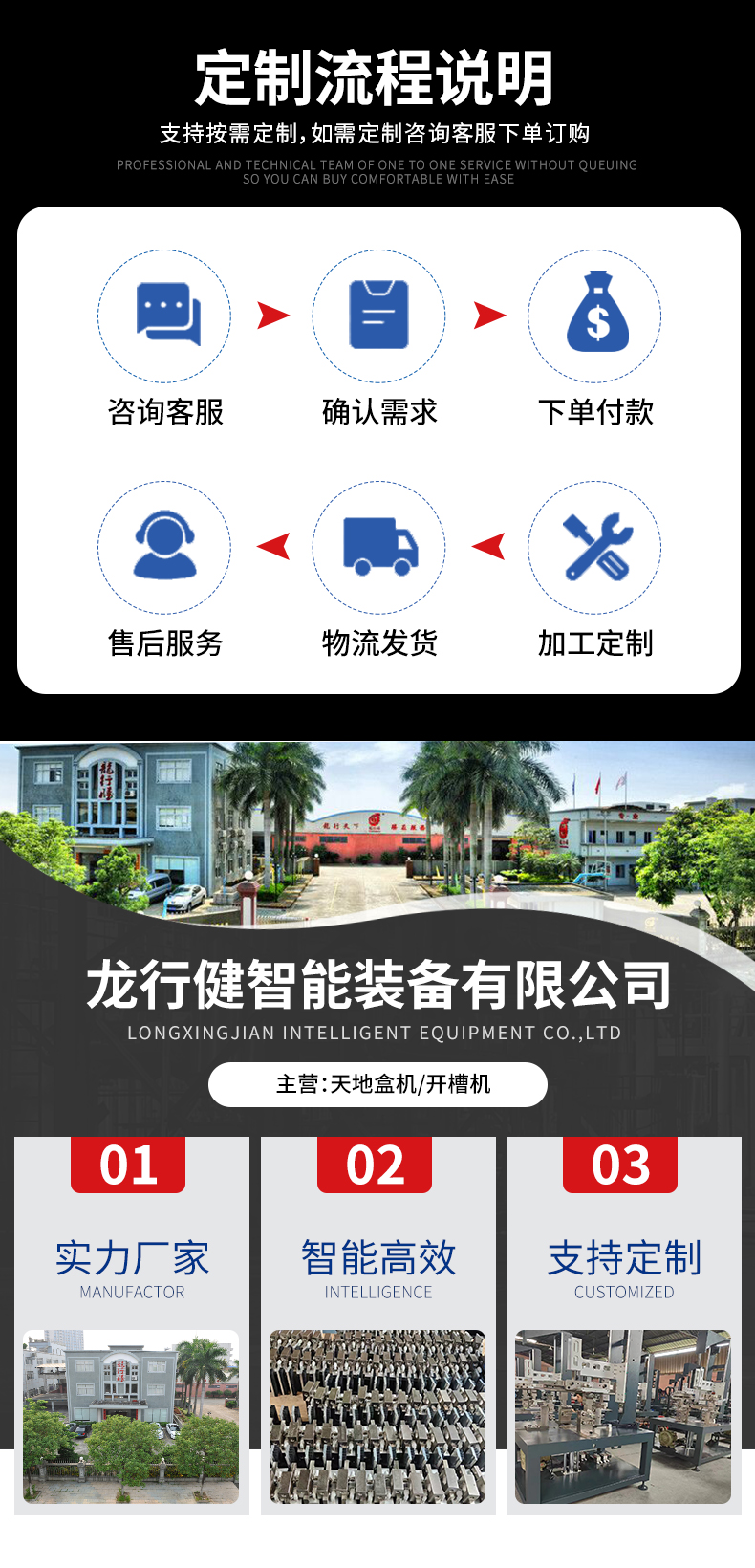 產品描述:廣東龍行健智能裝備有限公司是一家專業研發、生產、銷售全自動天地蓋機、全自動紙盒成型機、全自動開槽機、紙板開槽機、全自動紙盒成型機、全自動禮盒成型機、全自動天地蓋紙盒設備的企業。