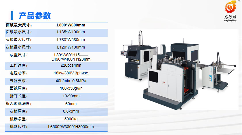 產(chǎn)品描述:廣東龍行健智能裝備有限公司是一家專業(yè)研發(fā)、生產(chǎn)、銷售全自動天地蓋機(jī)、全自動紙盒成型機(jī)、全自動開槽機(jī)、紙板開槽機(jī)、全自動紙盒成型機(jī)、全自動禮盒成型機(jī)、全自動天地蓋紙盒設(shè)備的企業(yè)。