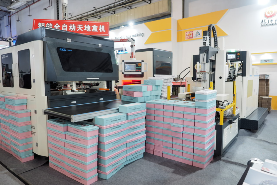 此次的雙工位智能天地盒自動線展示,讓客戶眼前一亮,與傳統的自動機相比,該機可同時做兩個盒子,每分鐘可達25對/分,產量翻倍,成品即可出貨,且場地面積節約一倍,適合種類需要天地盒同出的訂單。