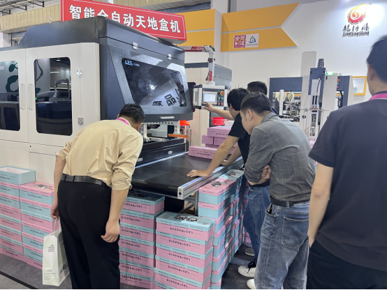 自動線此次展示鞋盒的生產,讓現場參觀人員駐足觀看,該機生產速度28個/分,讓他們贊嘆設備的速度比傳統天地盒設備快很多。